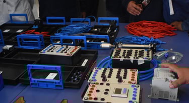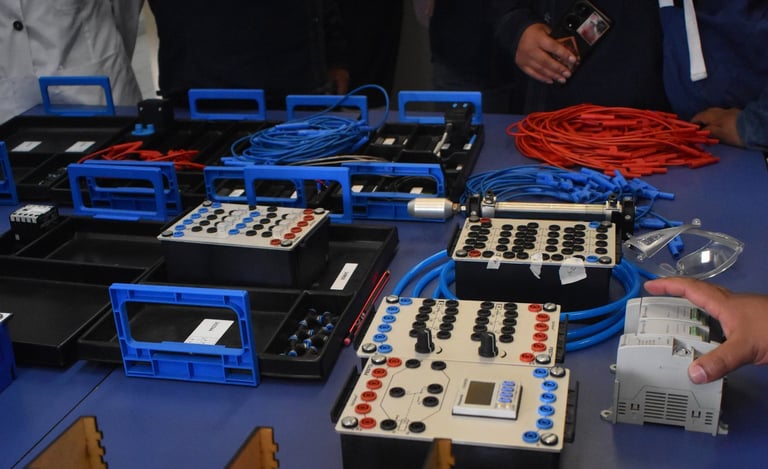 Los kits electroneumáticos constituyen la base del laboratorio, permitiendo a los estudiantes comprender el funcionamiento de los sistemas neumáticos y eléctricos que son esenciales en los procesos automatizados. A través de estos kits, los futuros ingenieros adquieren conocimientos fundamentales sobre el control de actuadores, válvulas y sensores, preparándose para aplicar estos principios en entornos industriales reales.