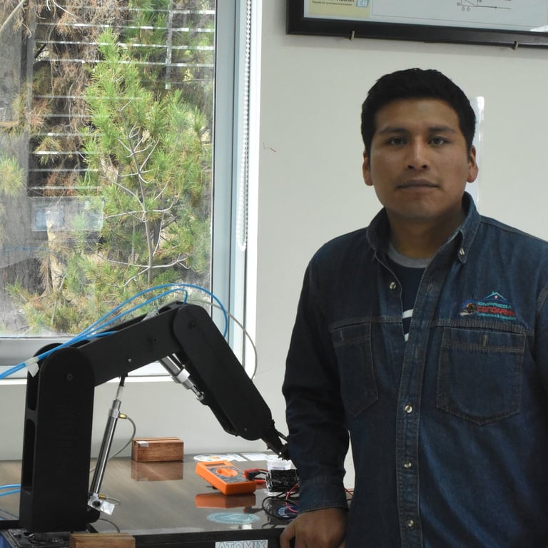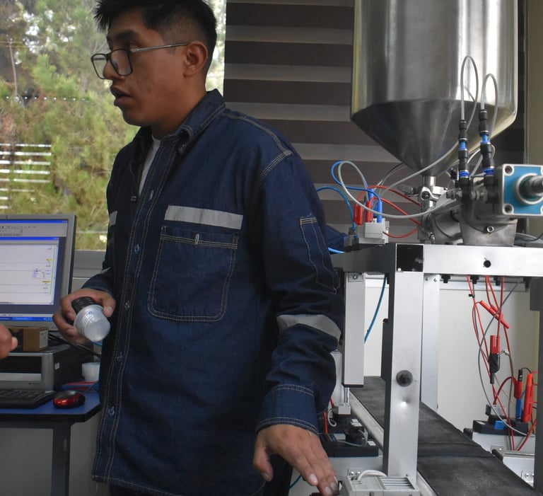 El Auxiliar Grover Huancani Zapana. Estudiante de la carrera de Ingeniería Industrial de la Facultad de Ingeniería de la UMSA, actualmente auxiliar de docencia en la materia de Automatización (IND-835). Se dedica al desarrollo y aplicación de sistemas automatizados, habiendo diseñado y provisto al laboratorio de la asignatura un brazo neumático funcional, adaptable a componentes eléctricos para prácticas didácticas. Su trabajo de titulación se centra en la automatización de un proceso de secado, integrando control y monitoreo industrial. Cuenta con experiencia en automatización de procesos productivos y ha colaborado en diversos proyectos aplicados al sector industrial.
