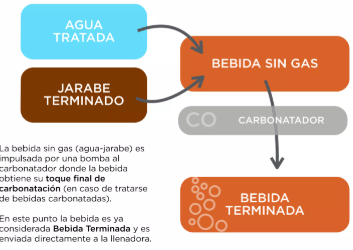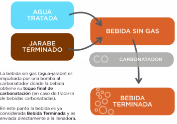 El Agua Tratada y el Jarabe Terminado, se dosifican en proporciones adecuadas en un depósito que los mezzia. La bebida sin gas (agua-Jarabe) es impulsada por una bomba al carbonatador (estanque) donde el líquido cae sobre una bandeja distribuidora, la cual tiene pequeñas perforaciones en línea con las placas de entrenamiento.